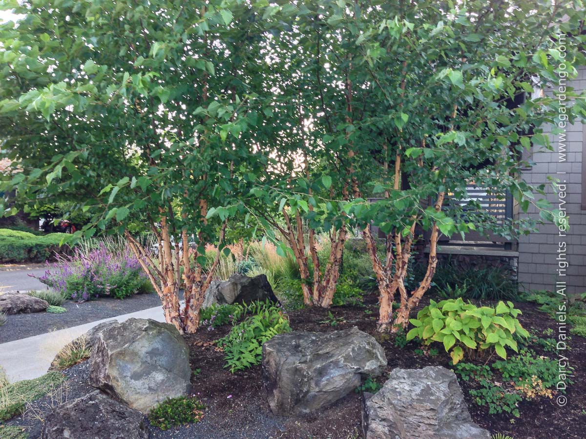 (Zone 4 to 9) is a dwarf river birch that is still surprisingly uncommon in Pacific Northwest gardens despite its many positive qualities. Chief among them is its fantastic winter bark which unfurls in papery thin sheets in salmon and tan tones. This, coupled with its dwarf growth habit, disease resistance, and drought tolerance make for a pretty darn desirable package.